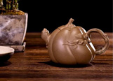此壶为歪南瓜壶式,壶体以阴文分割壶面,并装饰有南瓜枝叶藤蔓,惟妙惟肖...